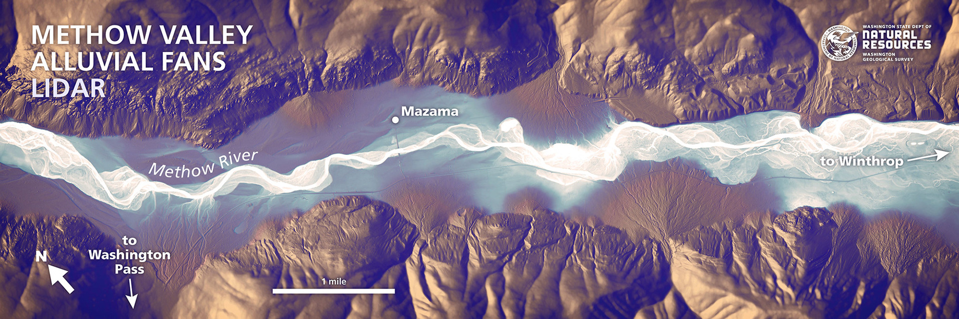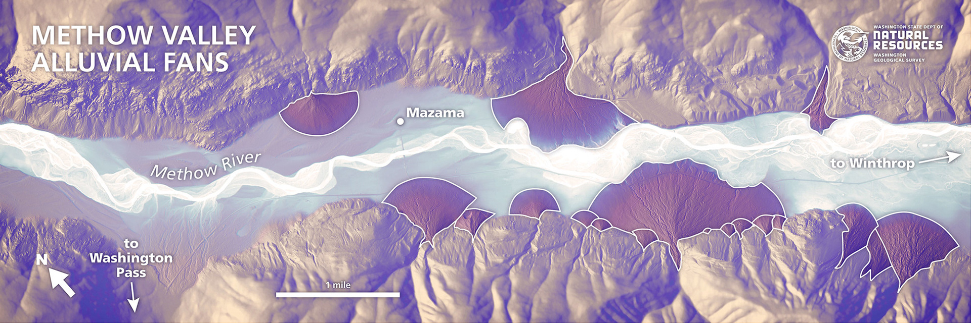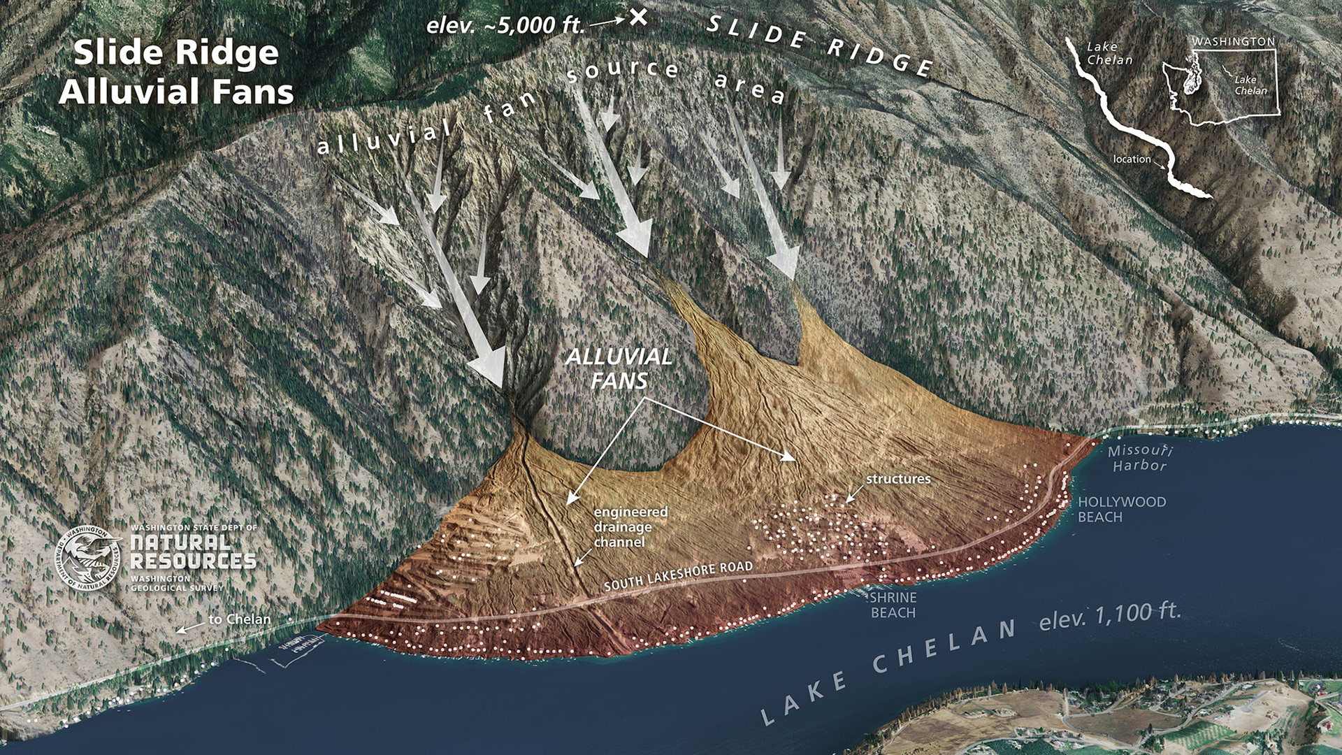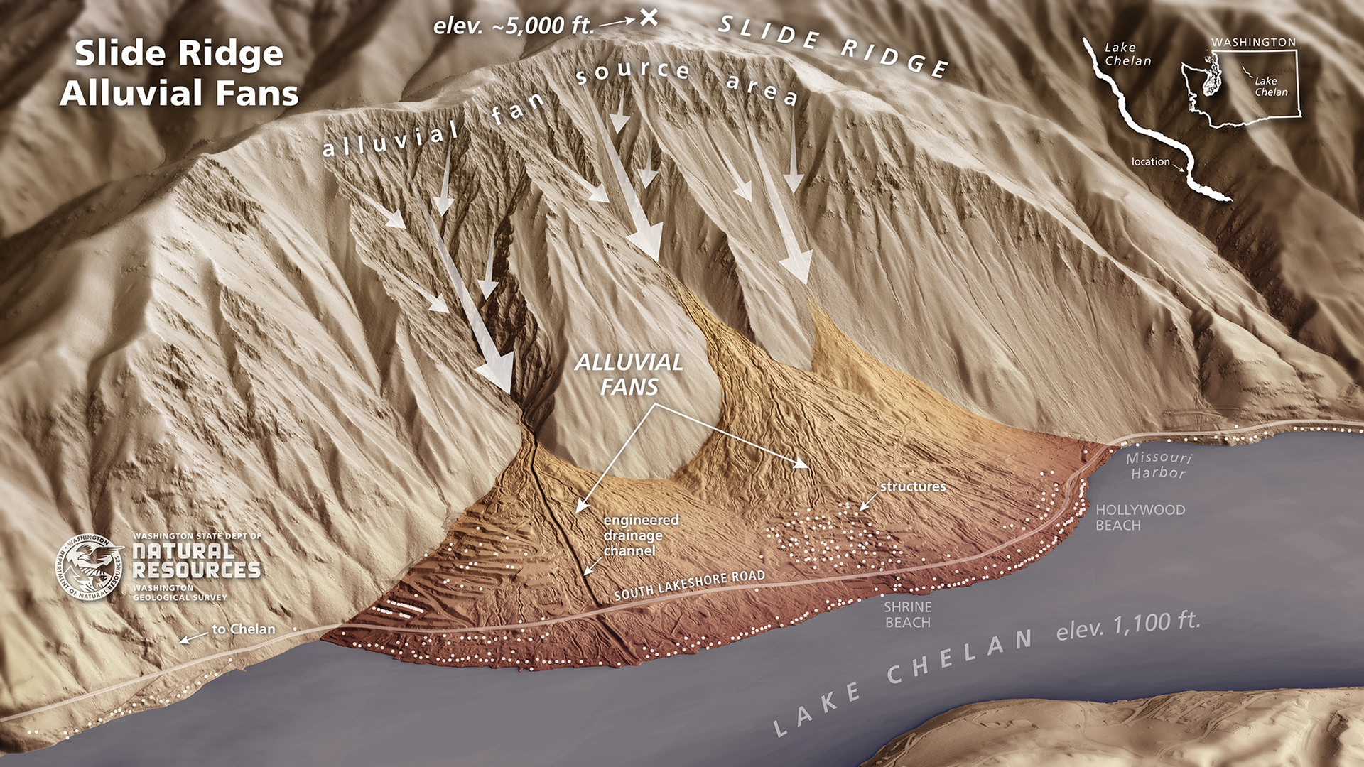 Alluvial fans are broad, gently sloping, fan-shaped landforms made of sediment and debris deposited when a stream emerges from steep hillslopes onto a wide, flat valley. Because these streams drain upland areas, alluvial fans are more prone to floods and debris flows. Here are visualizations featuring alluvial fans along Washington's Lake Chelan and Methow Valley. Made for the Washington Geological Survey