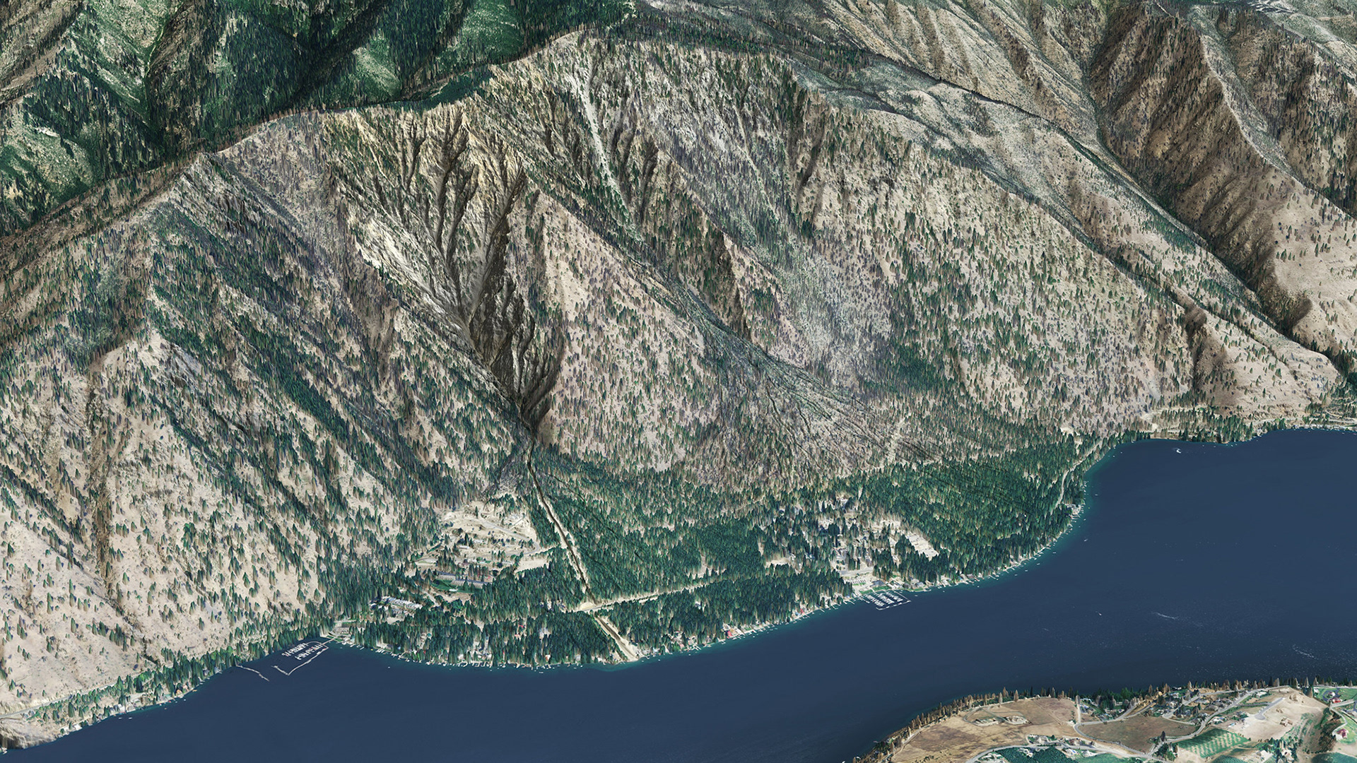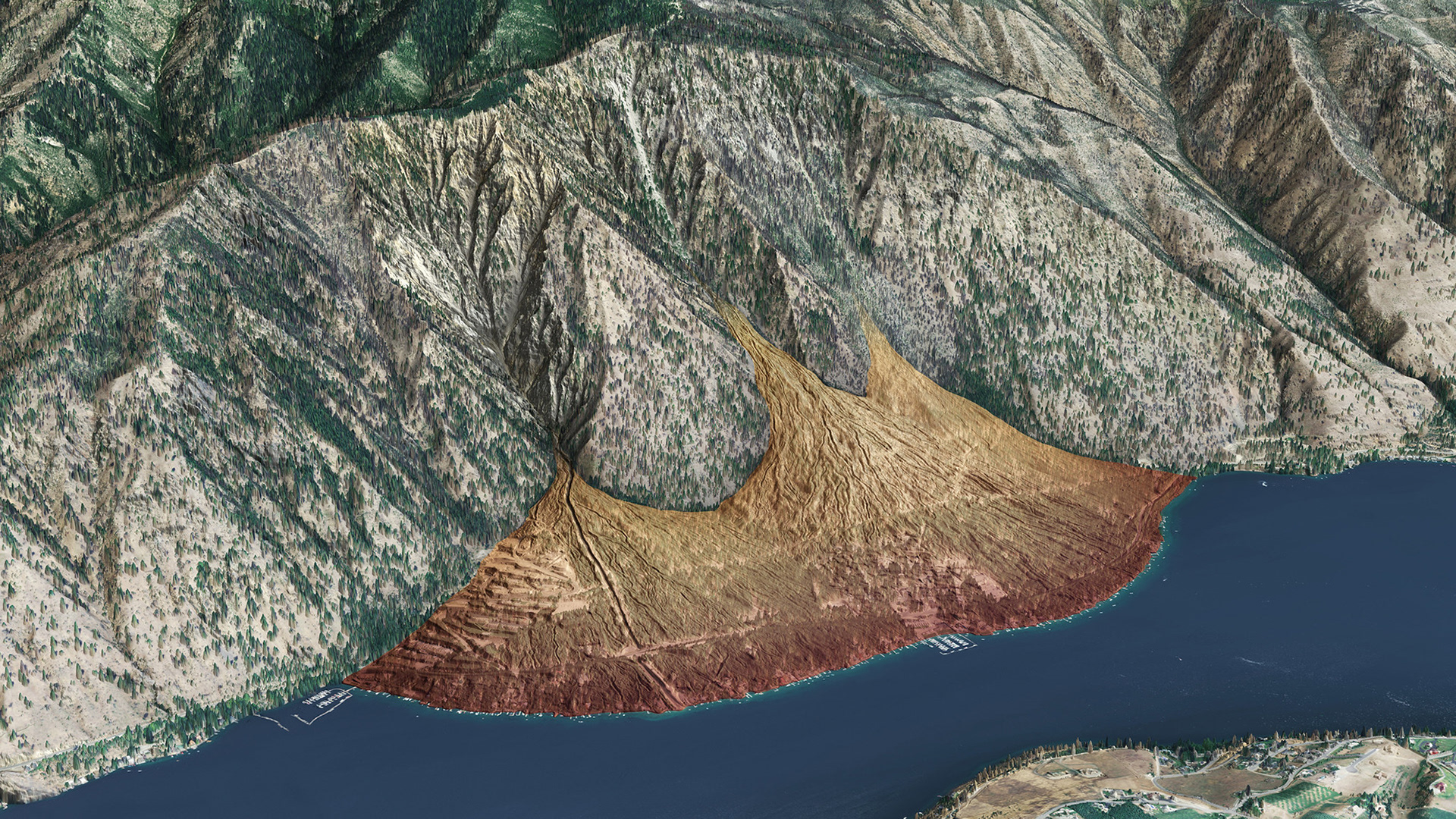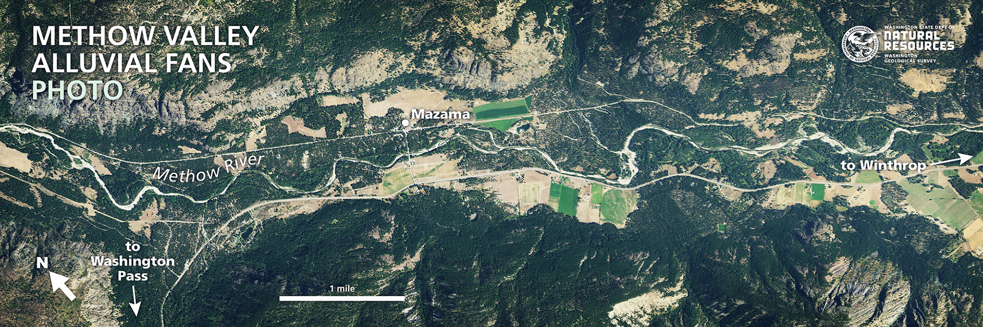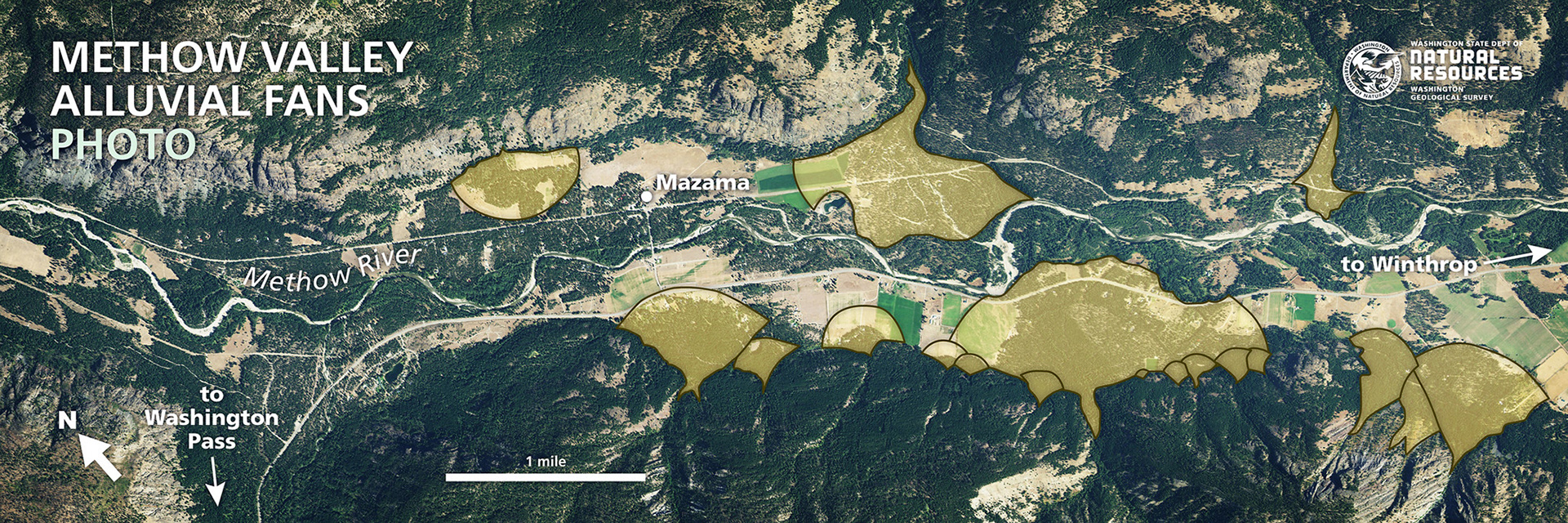 Alluvial fans are broad, gently sloping, fan-shaped landforms made of sediment and debris deposited when a stream emerges from steep hillslopes onto a wide, flat valley. Because these streams drain upland areas, alluvial fans are more prone to floods and debris flows. Here are visualizations featuring alluvial fans along Washington's Lake Chelan and Methow Valley. Made for the Washington Geological Survey