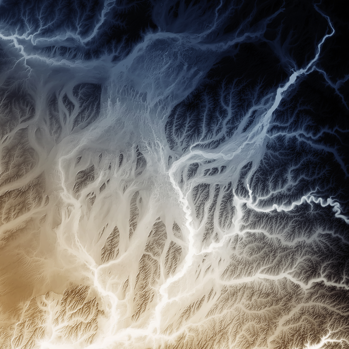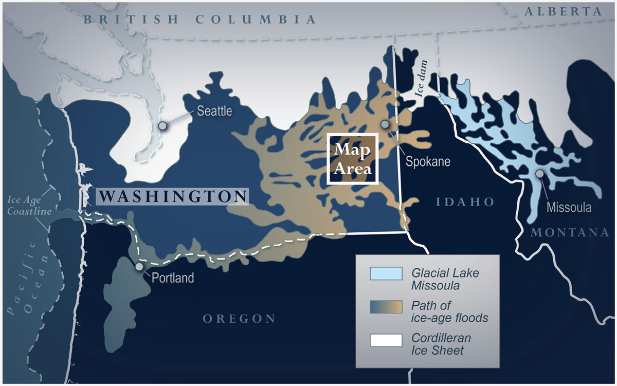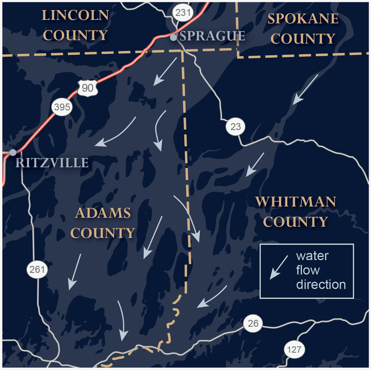 This map depicts topographic evidence of the Missoula Floods on a portion of the Channeled Scablands in eastern Washington known as the Cheney–Palouse scabland tract. Made for the Washington Geological Survey.