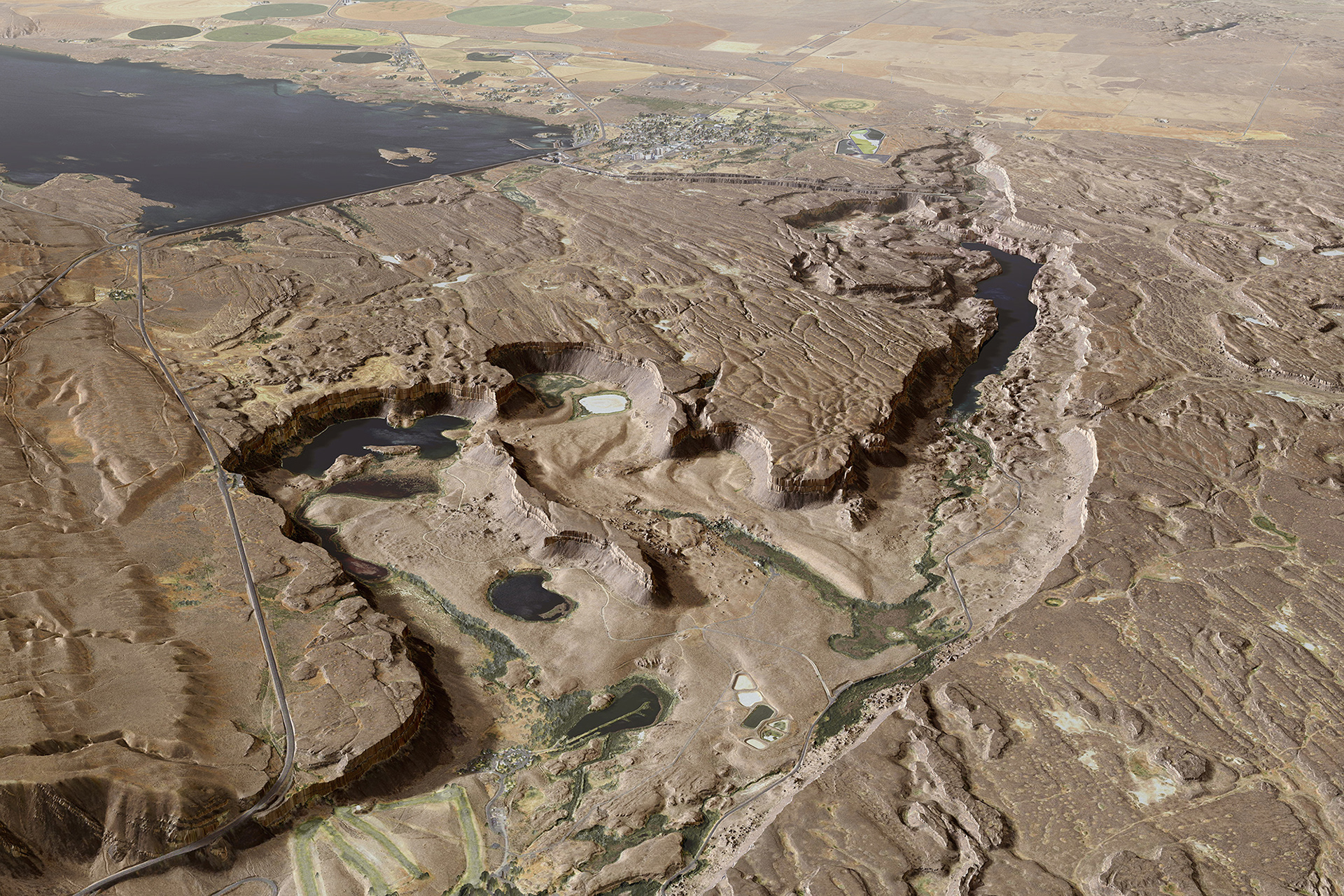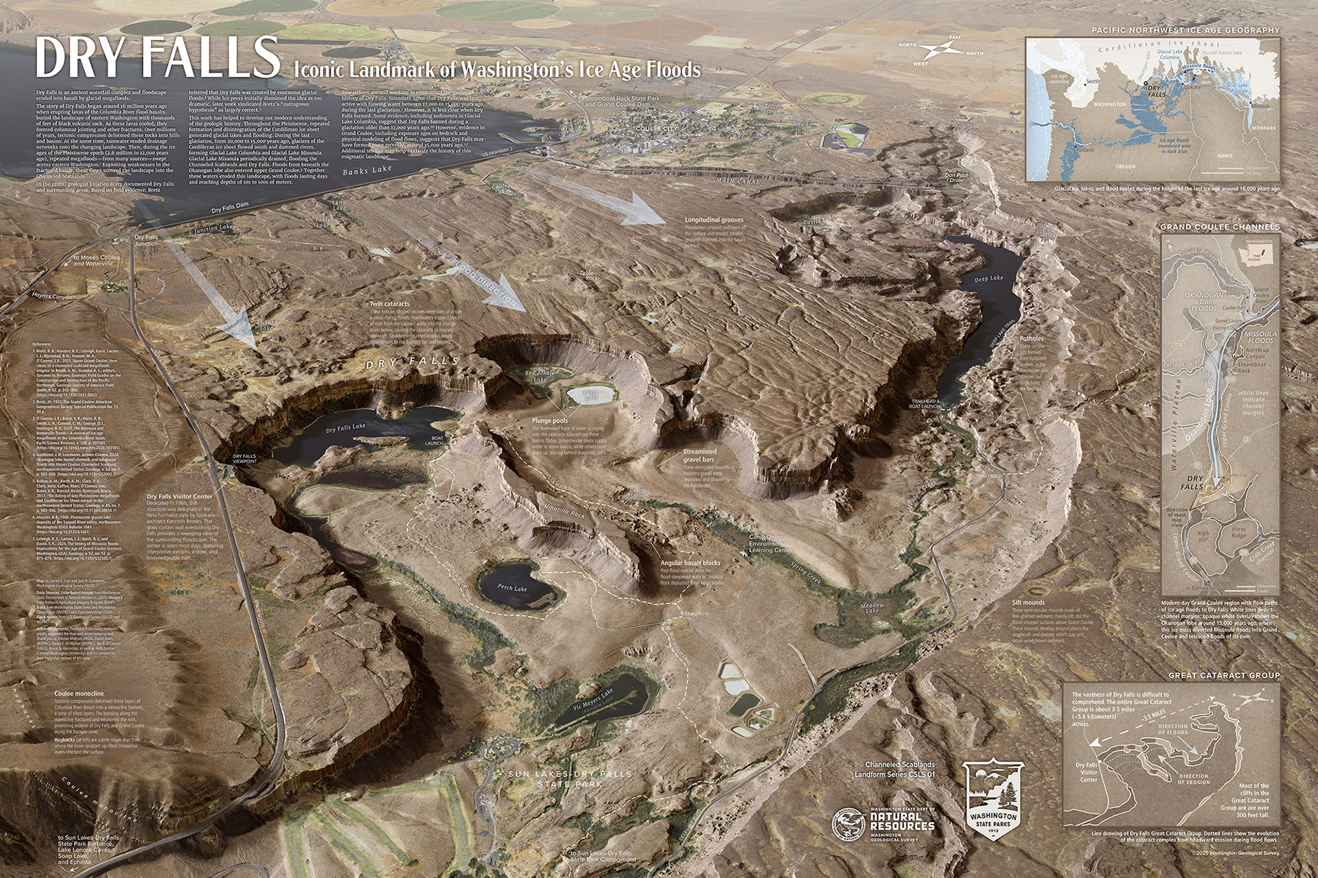 Dry Falls, in Washington State’s Channeled Scablands, is one of the most geologically significant sites in the Pacific Northwest. The eroded landscape at this iconic location bears evidence of catastrophic glacial outburst floods from the last ice age. This interpretive map provides a bird’s eye view of the huge landforms at Dry Falls. This map was a collaboration with Joel H. Gombiner for the Washington Geological Survey.