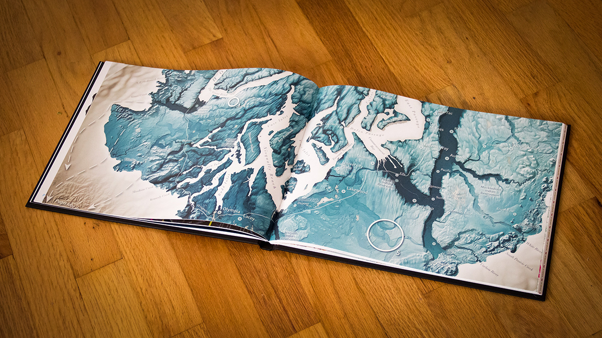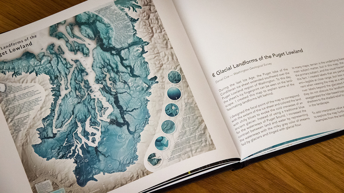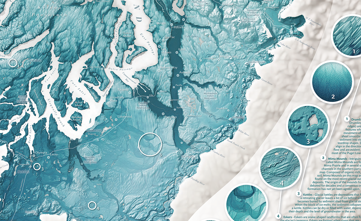Interpretive lidar-based map showing glacially-created landforms of the Puget Lowland in Washington, USA. Drumlins, kettles, eskers and glacial outwash channels are featured. The map was included in the North American Cartographic Information Society's Atlas of Design IV. Made for the Washington Geological Survey.