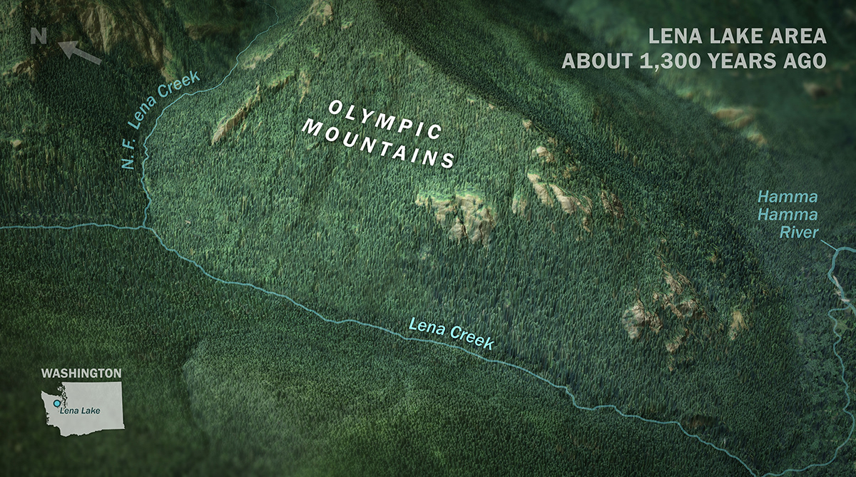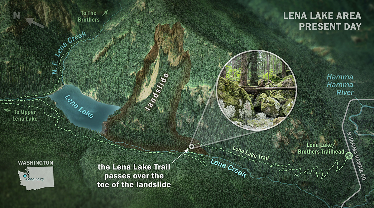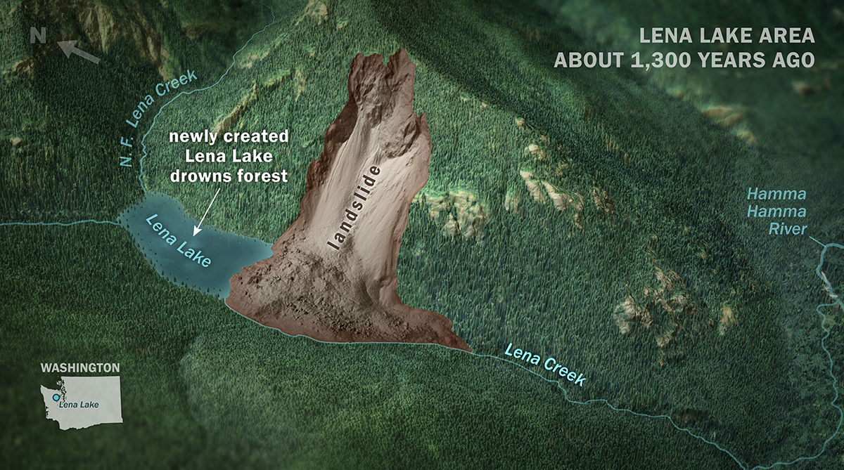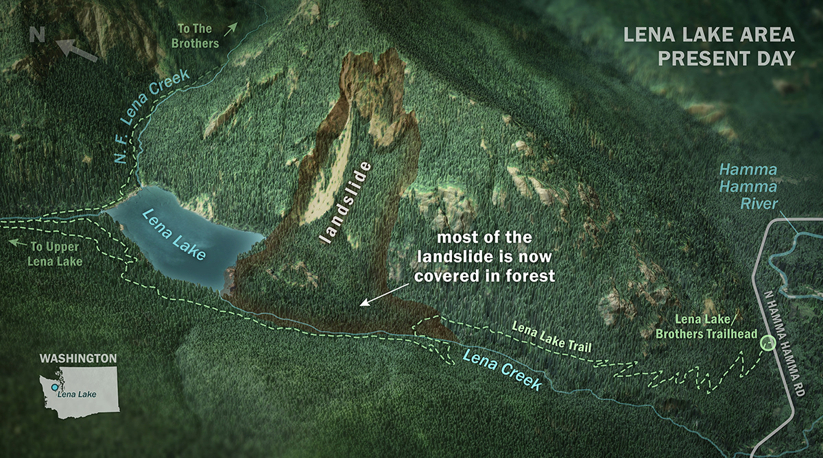 Lena Lake, in Washington's Olympic Mountains, formed about 1,300 years ago, when a landslide blocked off Lena Creek. This lidar-derived visualization sequence shows how this recreation destination was formed, and connects the past to present-day. Scroll down to see the full image series. Made for the Washington Geological Survey's Washington 100 geotourism project.