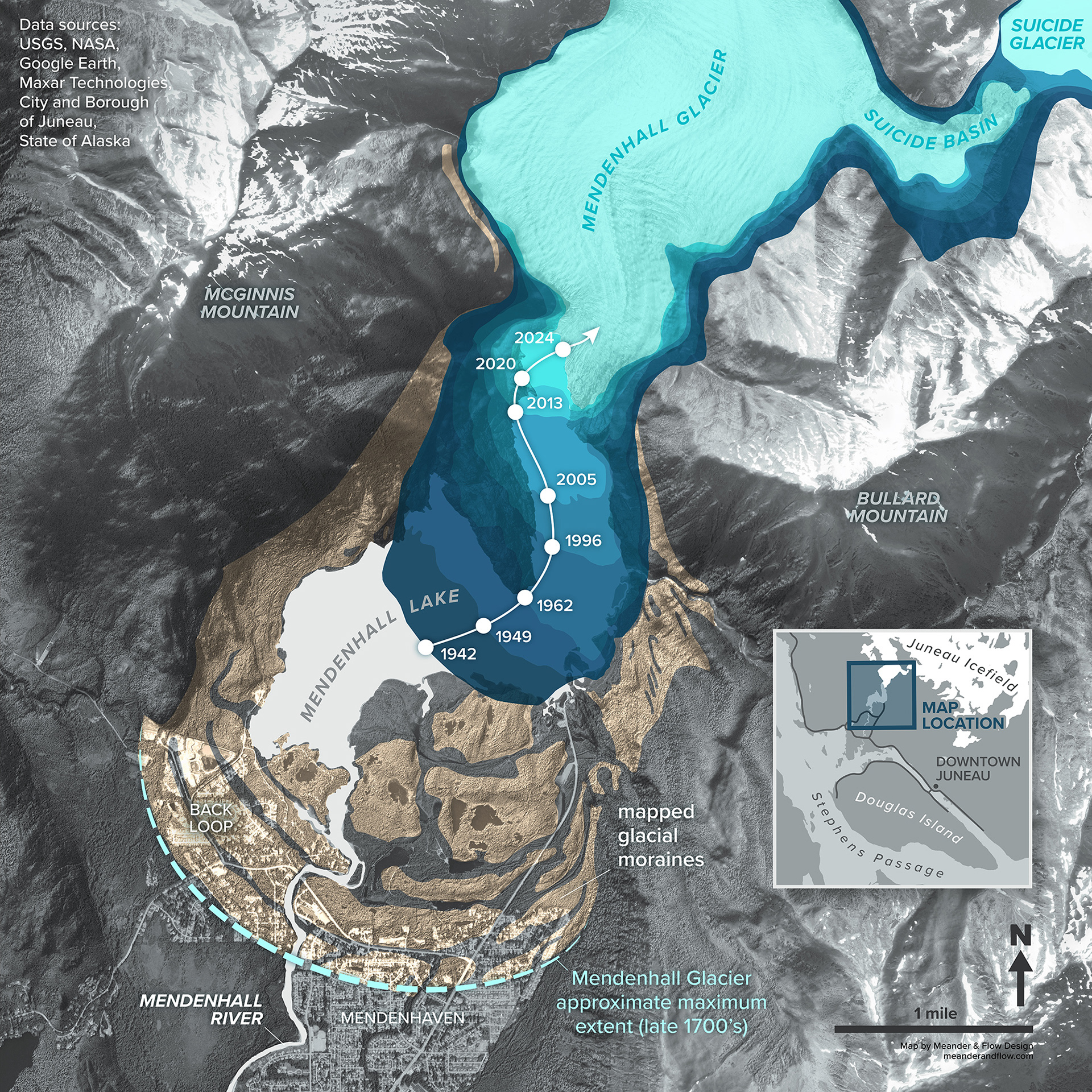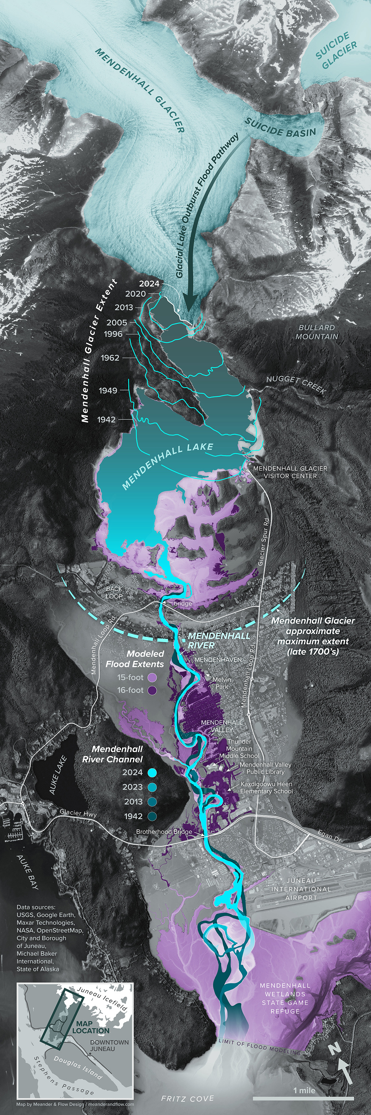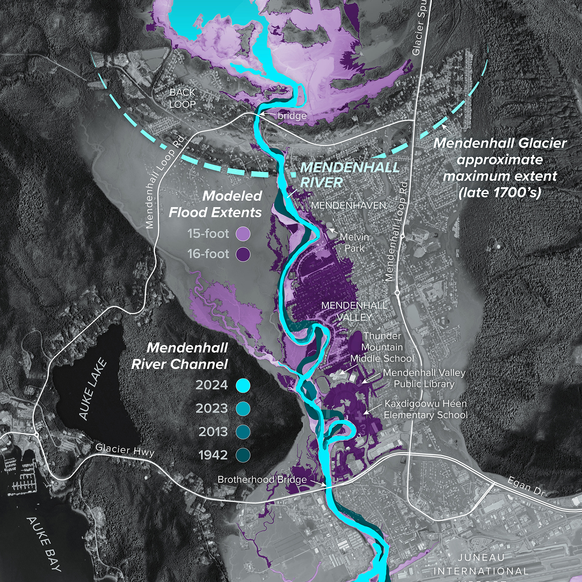Maps for KTOO Media's podcast Outburst, a series about the recent glacial outburst flooding in Juneau, Alaska's Mendenhall Valley. From KTOO: "Hundreds of people in Juneau’s Mendenhall Valley are living on the front line of a climate change disaster they didn’t see coming. This is the story of how glacial outburst flooding has escalated faster than human imagination – and public policies to protect people."