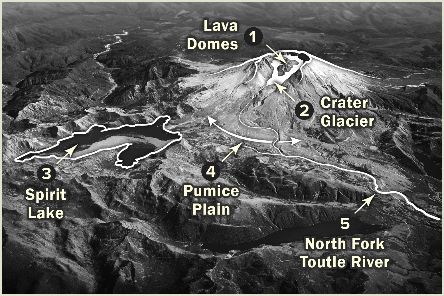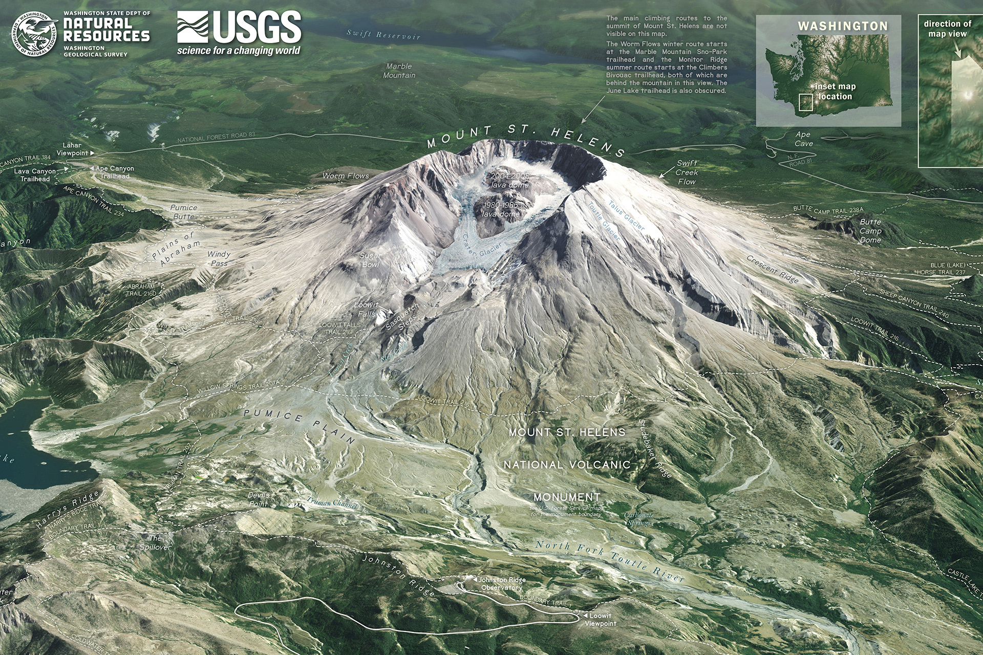 This map features a bird’s-eye view of the volcano that famously erupted on May 18, 1980. That eruption instantly transformed the glacier-capped volcano and its surrounding forests and lakes into an unrecognizable landscape, permanently altering its physical form and catastrophically disrupting its mountain ecosystem. In the years and decades that followed, however, streams carved new paths through the volcanic deposits, the volcano grew bulky lava domes, and within the steep crater walls, a new glacier was born. Today, plants and animals have repopulated the lakes and lands around the volcano and life is once again flourishing. This poster shows several examples of Mount St. Helens’ transformation; its metamorphosis through time demonstrating the resilience of nature and life. Made for the Washington Geological Survey, in partnership with the USGS.