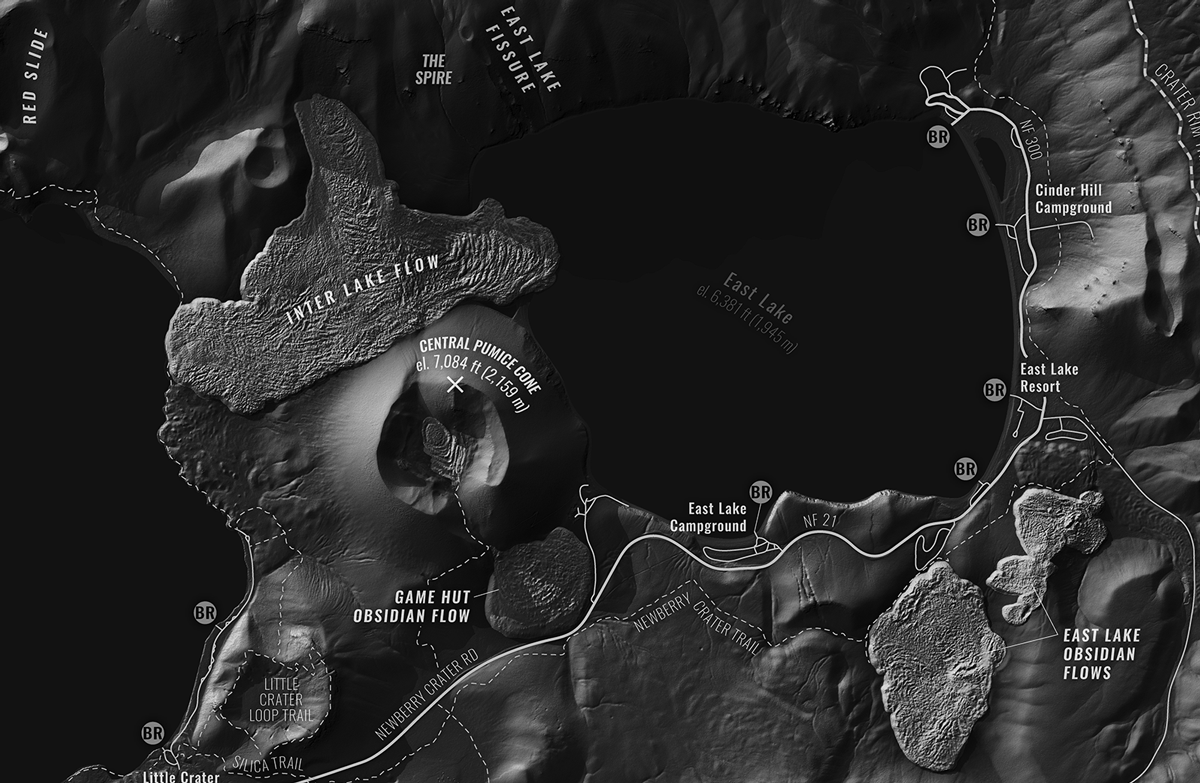 Obsidian-inspired monochrome map of the Newberry Caldera in central Oregon.