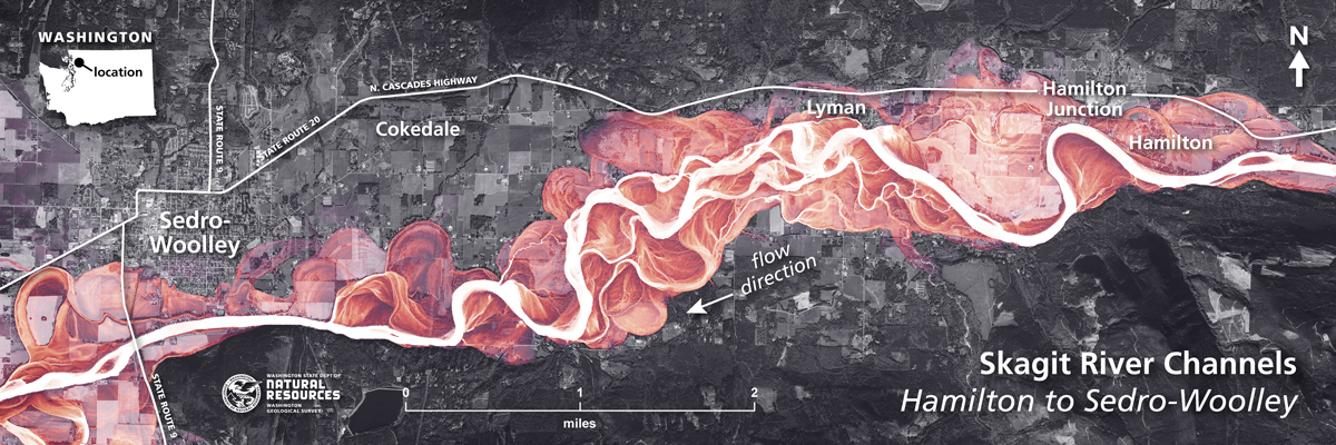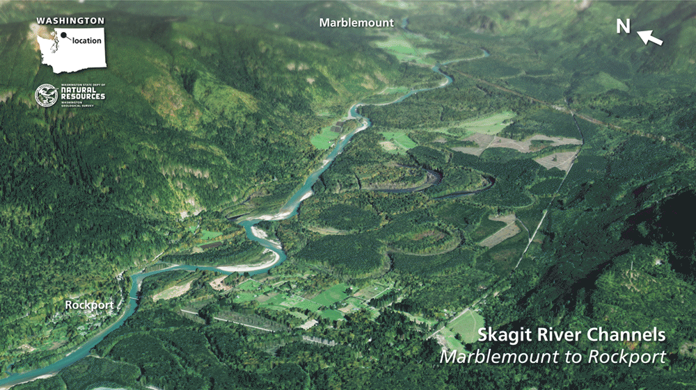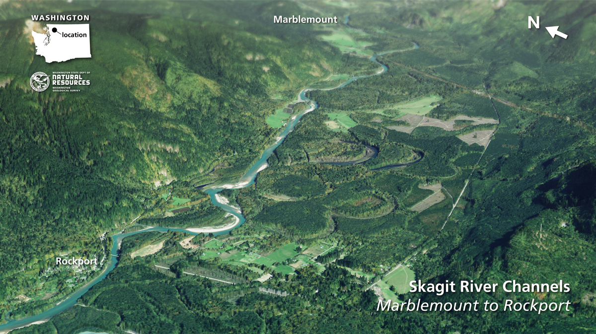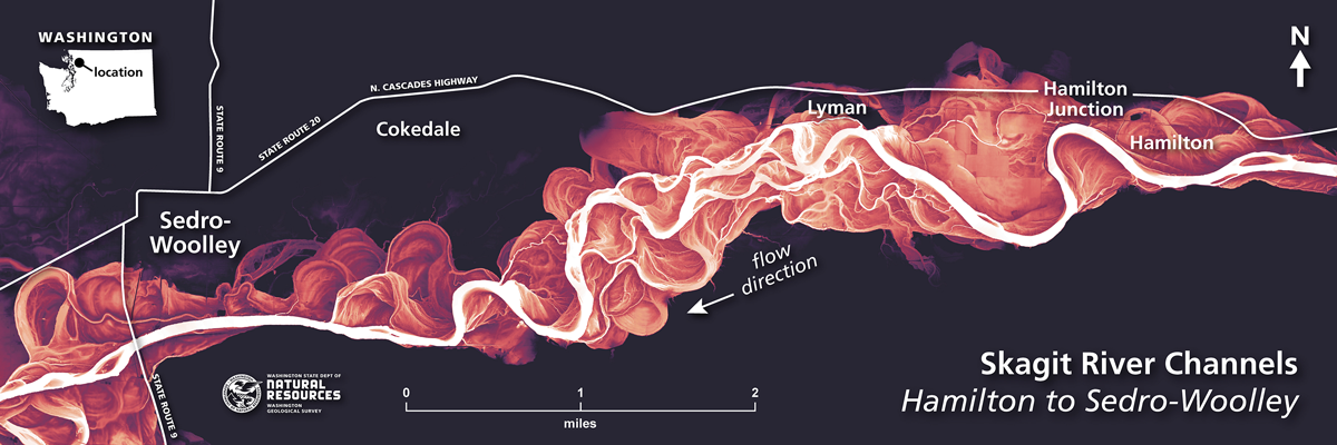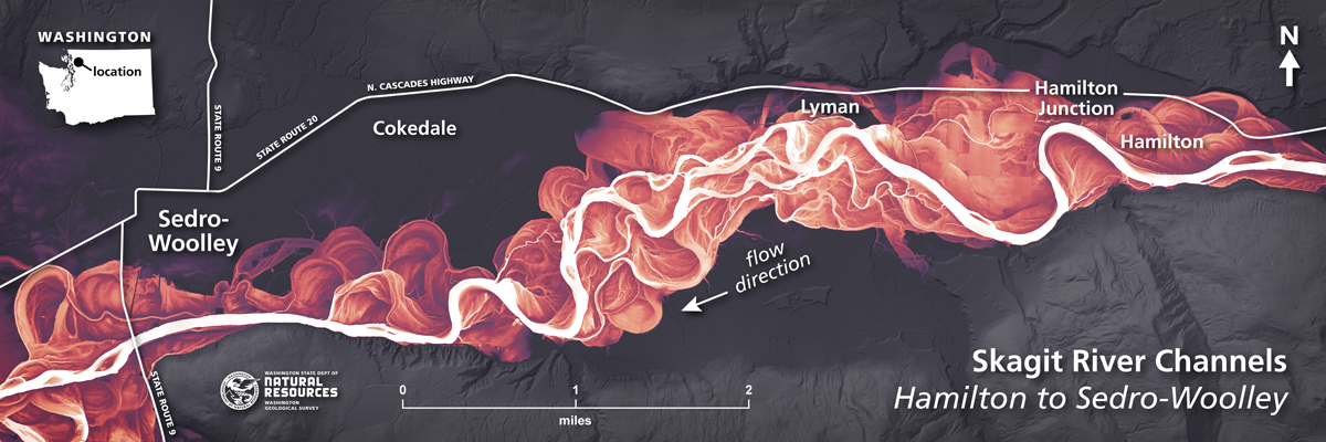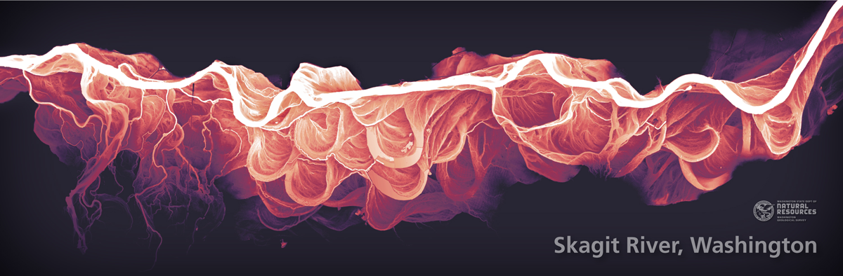 Layers of lidar and imagery reveal the current and former channels of the Skagit River as they wind their way through the communities in the Skagit Valley of northwest Washington. Made for the Washington Geological Survey.